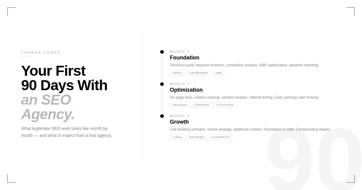 A good SEO agency in Tampa should have a clear onboarding process. Here's what the first 90 days of legitimate SEO work looks like: