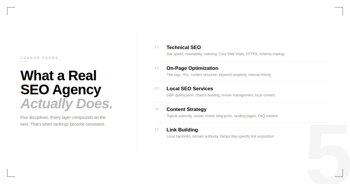 Search engine optimization is not a single service. It's a system made up of interconnected disciplines — and a good seo agency tampa should be competent across all of them.