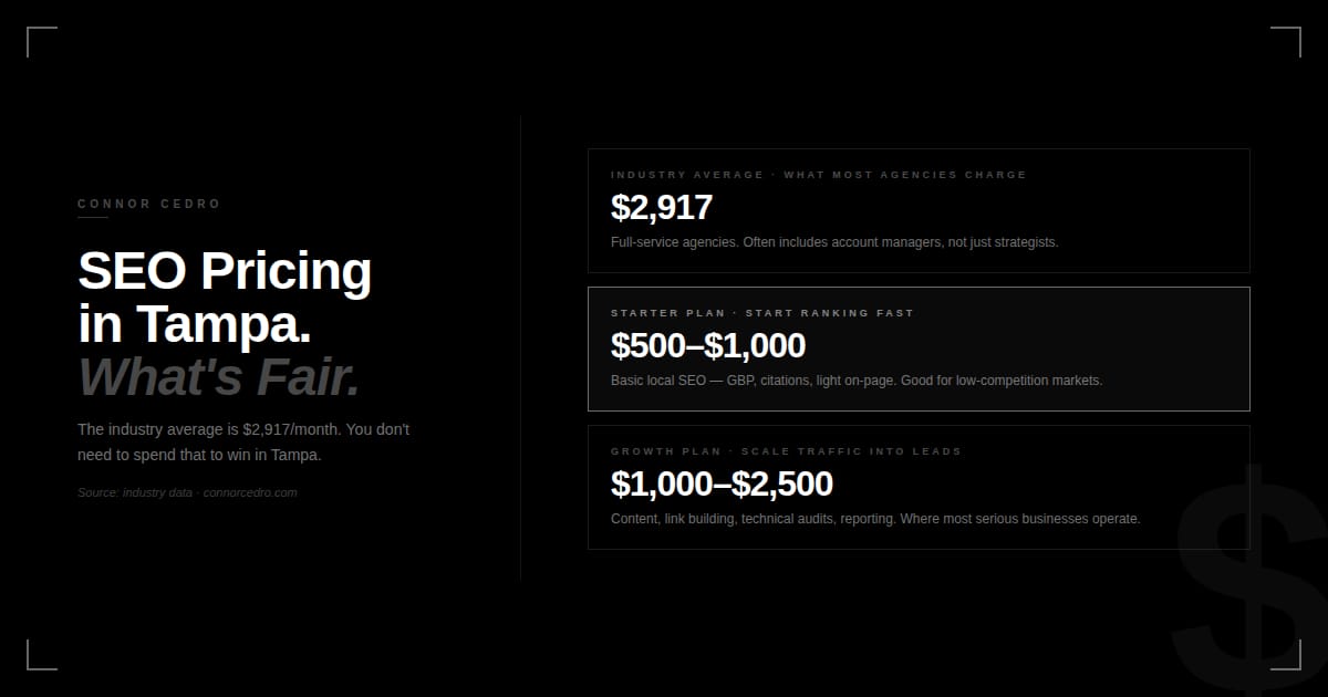 The industry average for SEO services sits around $2,917/month according to industry data. You don't need to spend that to win in Tampa — but you do need to spend enough to get real work done. Agencies offering full-service SEO for $300/month are not doing meaningful work.