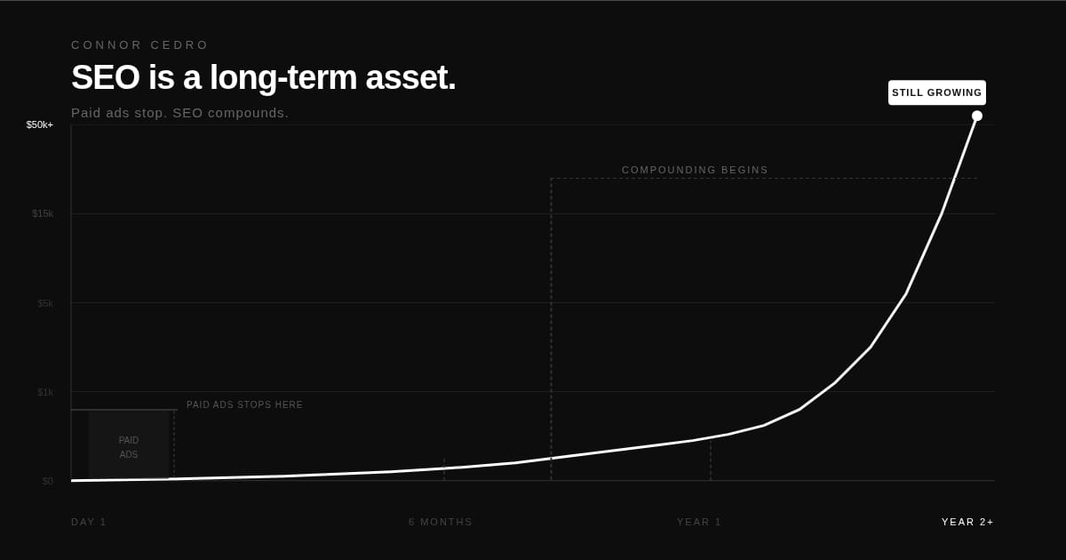 For entrepreneurs, that means every dollar invested in SEO produces returns that grow month after month — not just while the campaign is running.