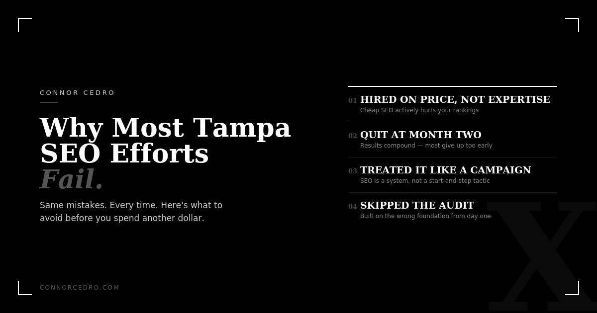 A real Tampa SEO company starts with an audit. Not a sales pitch. An audit. Before recommending anything, you need to understand what's actually holding a business back. You can see exactly how I approach this on my Tampa SEO company page.