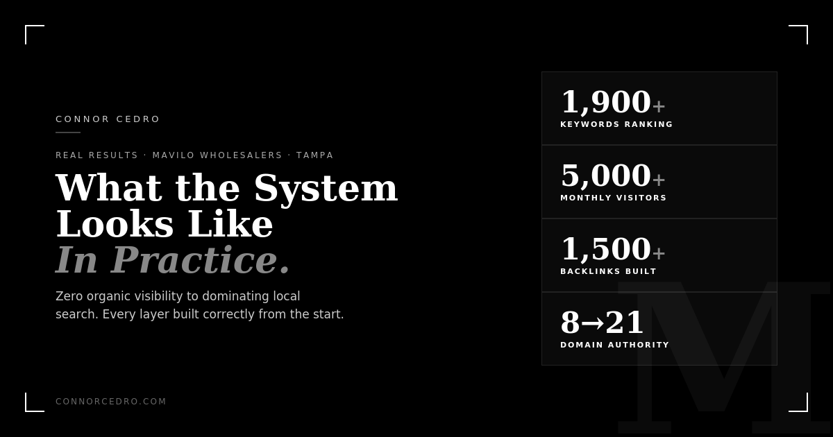 Mavilo Wholesalers came to me with near-zero organic visibility. No meaningful rankings. No organic traffic worth mentioning. A domain authority of 8.